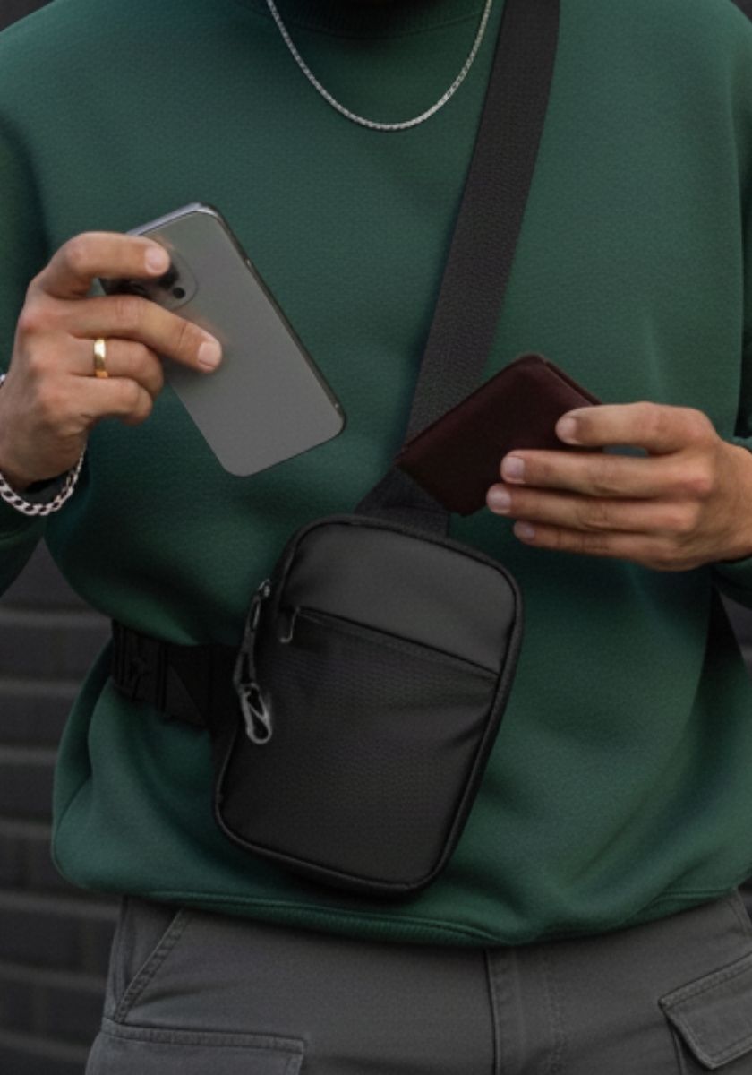 Le format est optimisé pour accueillir tous vos essentiels. La sacoche vous libère du désordre et de l'inconfort des poches pleines, tout en restant discrète.